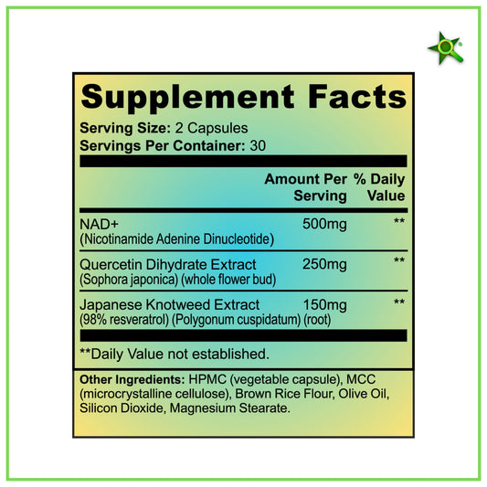 NAD+ (Nicotinamide Adenine Dinucleotide) with Quercetin and Resveratrol - Support Healthy Aging, Methylation, Cellular Energy Production and Metabolism* - 60 Vegan Capsules