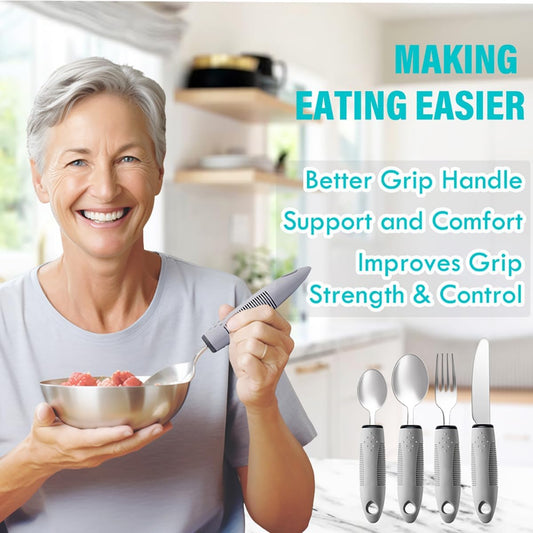 Adaptive Utensils 4pcs For Hand Tremors,Elderly, Arthritis,Parkinsons-Built Up Utensils For Adults 2.5oz Each, Silverware Set With Handle, Flatware Cutlery Set For Seniors