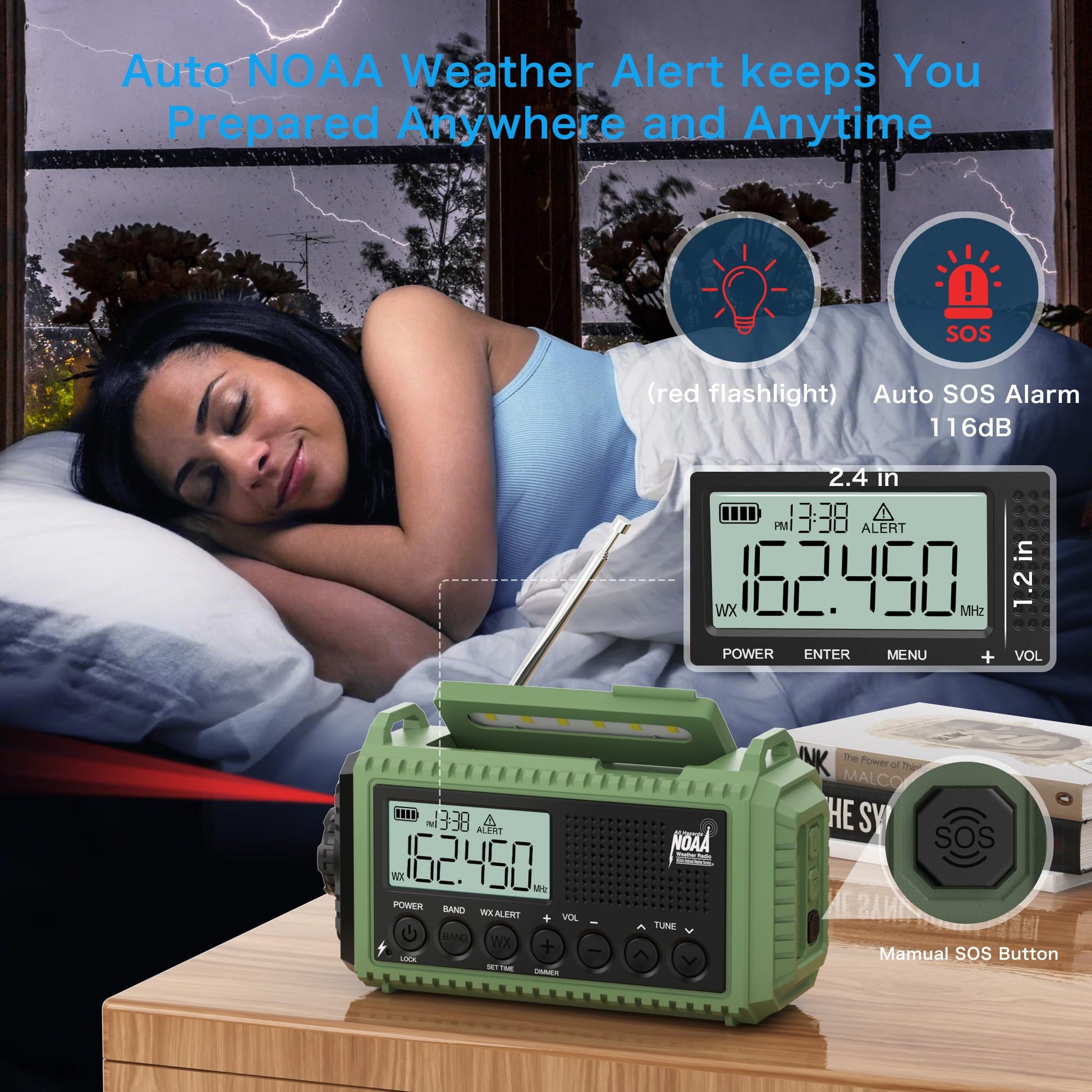 - ใAuto Scan NOAA Weather Alert & AM/FM/SW Radio PlayใUpgraded from the CR1009 Version, this CR1009pro ๐ก๐ข๐๐ ๐ช๐ฒ๐ฎ๐๐ต๐ฒ๐ฟ ๐ฅ๐ฎ๐ฑ๐ถ๐ผ can get quick access to your favorite am fm band with auto scan function. After preset WX alert and set a timer, it can auto scan 7 NOAA Weather Stations to receive local hazard weather and warn you by an extra loud siren and red alert light, the WX alert icon and the backlight on the LCD Screen also flicker. You will never miss the alert even at sleeping night.