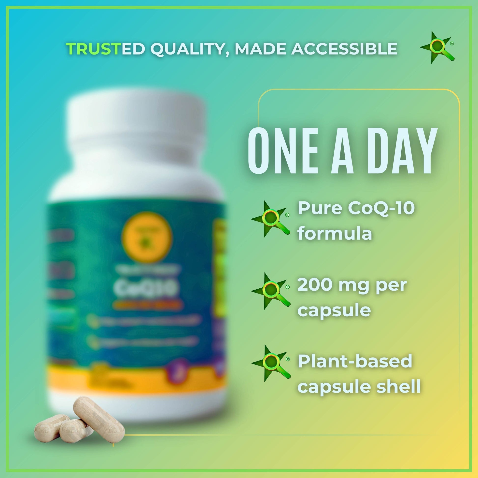 Ingredients: Coenzyme Q-10 (Ubiquinone), Hypromellose (vegetable capsule), Rice Flour.