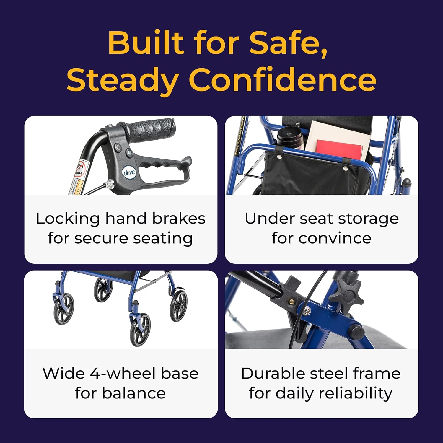 Drive Medical 10257BL-1 4 Wheel Rollator Walker With Seat, Steel Rolling Walker, Height Adjustable, 7.5" Wheels, Removable Back Support, 300 Pound Weight Capacity, Blue