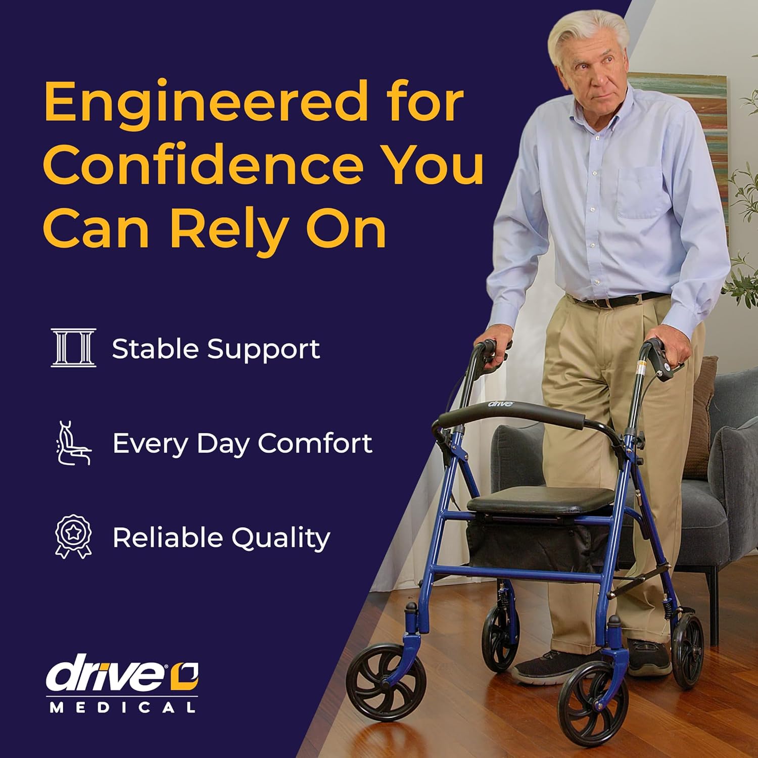 The Drive 4 Wheel Rollator Walker with Seat is designed to provide dependable support, comfortable mobility, and user-friendly features for seniors, adults, and anyone seeking greater stability. Built with durable steel construction, the rollator offers a strong and steady walking frame that helps users move with confidence whether navigating indoors or outdoors. The thoughtfully designed padded seat provides a comfortable resting spot during longer outings, while the removable hinged backrest adds extra support and can be folded down when not needed. This rollator is equipped with smooth-rolling 7.5-inch caster wheels that help users maintain steady movement across various surfaces, making it suitable for both home and healthcare use. The convenient hand brakes allow for easy speed control and can be locked securely for stationary seating. An under-seat personal item pouch provides a discreet storage solution for essential belongings, supporting everyday independence. With a dependable 350-lb weight capacity and a long-lasting steel frame, this rollator is built to serve as a reliable mobility companion. Its blend of strength, comfort, and ease of use makes it an excellent choice for daily support, rehabilitation needs, or maintaining independence. Founded in 2000, Drive Medical has rapidly become a leading manufacturer of durable medical equipment with offices throughout the world. With the 2015 acquisition of DeVilbiss Healthcare, an innovator in respiratory care since 1888, we expanded to include a full line of reliable oxygen and respiratory products used in more than 100 countries. Our name, Drive Medical, reflects both our dynamic, forward-moving spirit as well as this long legacy of supporting lives.