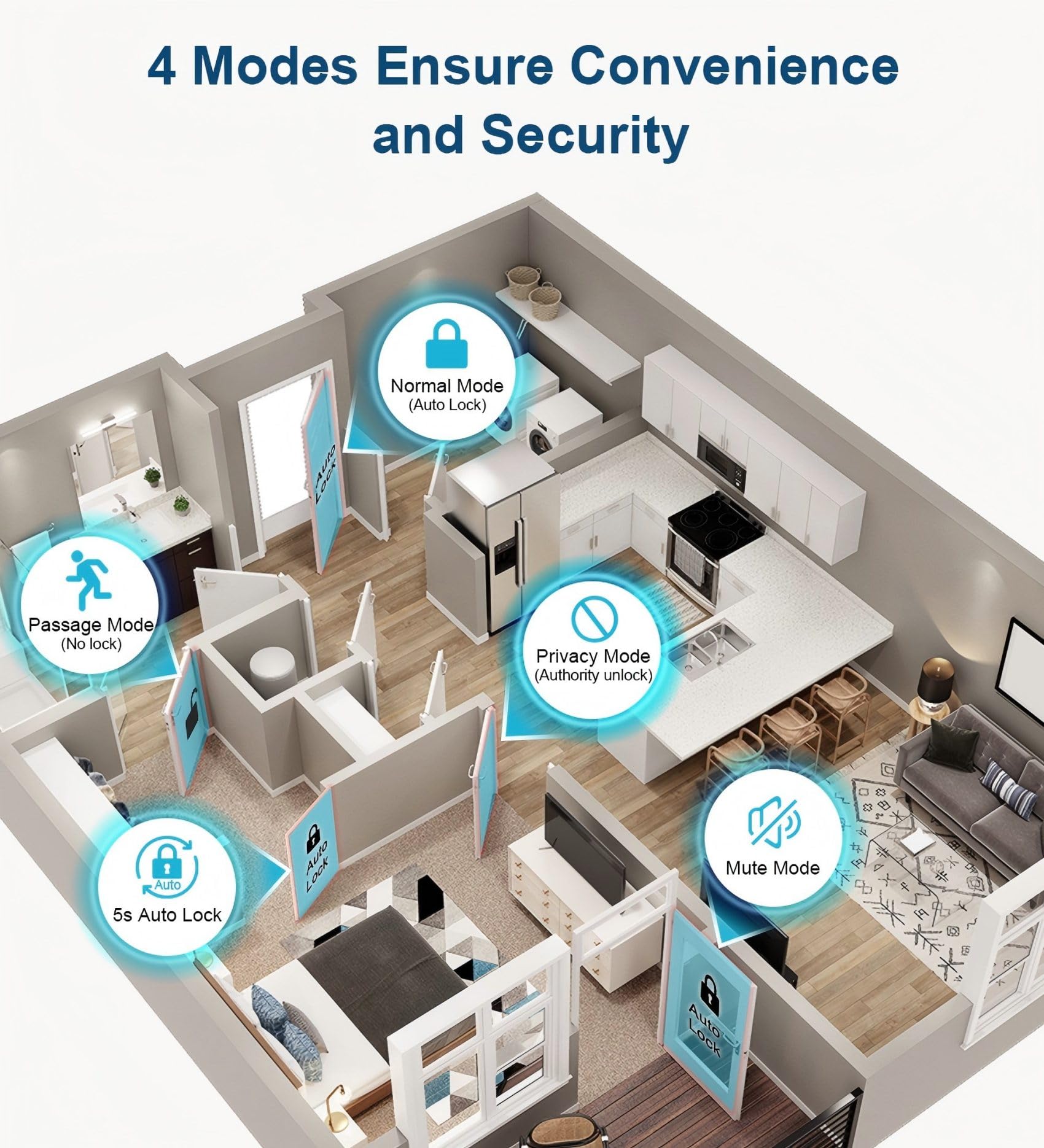 - THREE MODES FINGERPRINT DOOR KNOB: Designed to provide convenience and enhanced privacy to homeowners. Easily switch modes by rotating your thumbprint around the smart door knob. The modes are passage mode, entrance mode, and privacy mode. Perfect bedroom door knobs with lock to keep unwanted guests like roommates or kids from entering your peaceful space.