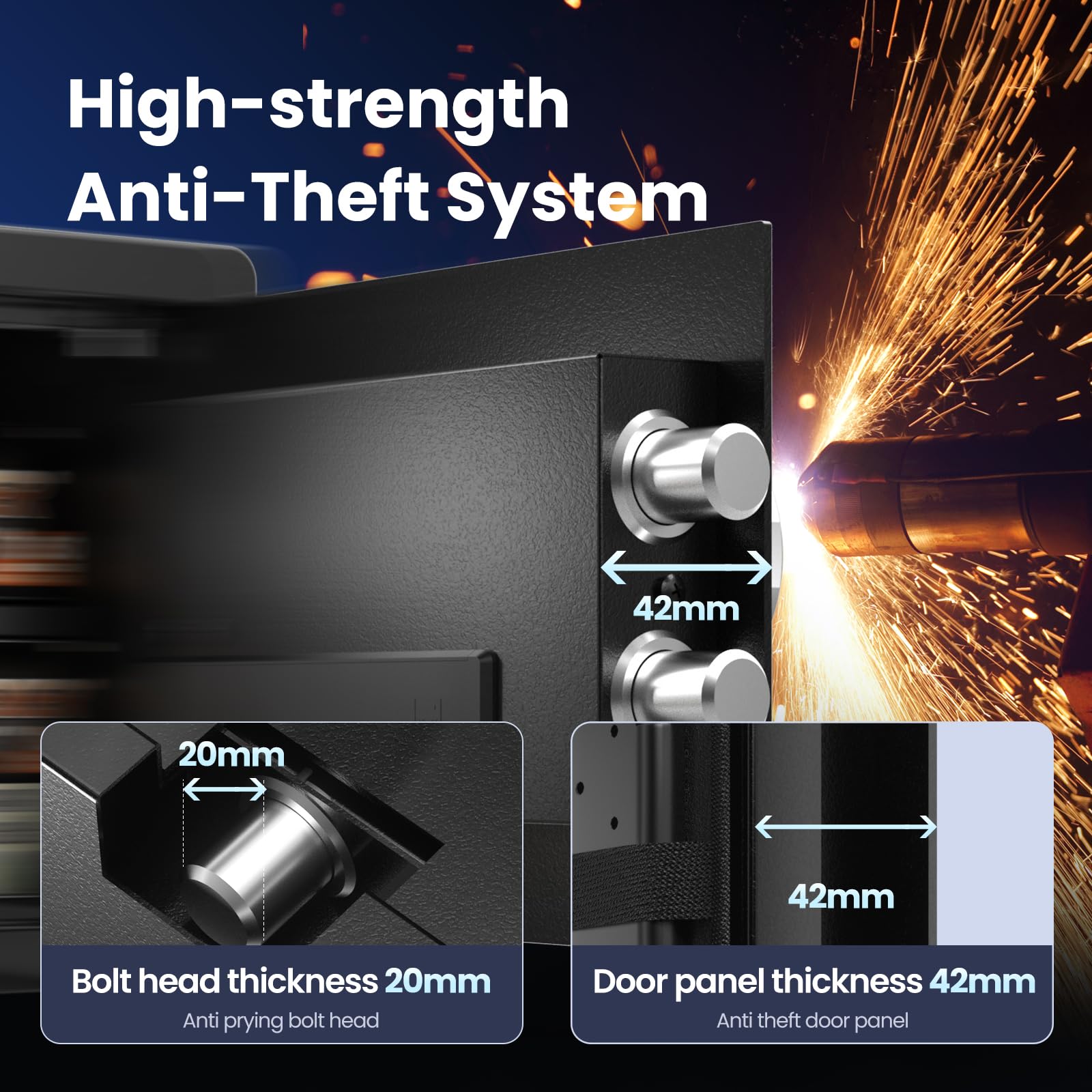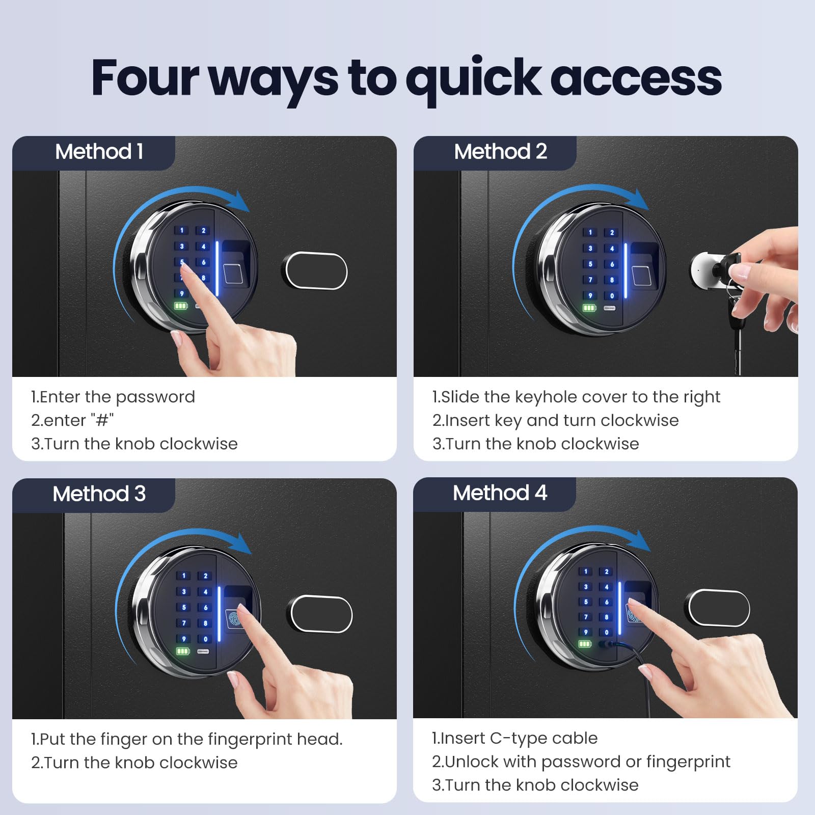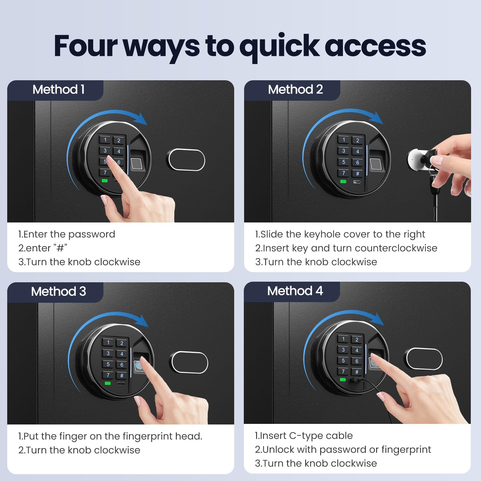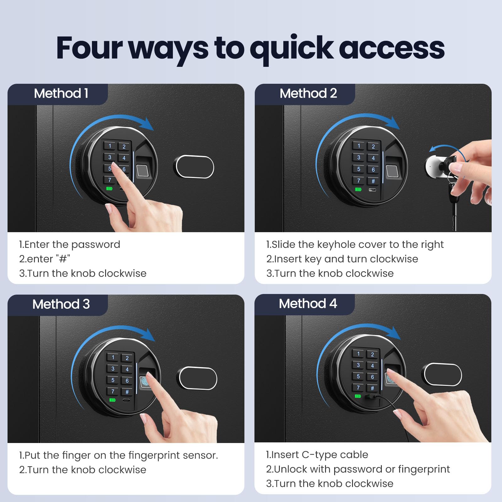- Metal Turntable & Rugged: The finger print safe has improved the knobs with upgraded metal ones to enhance the quality of the fingerprint safe, and the usual heavy door and thick walls make the safe very difficult to steal and long-lasting