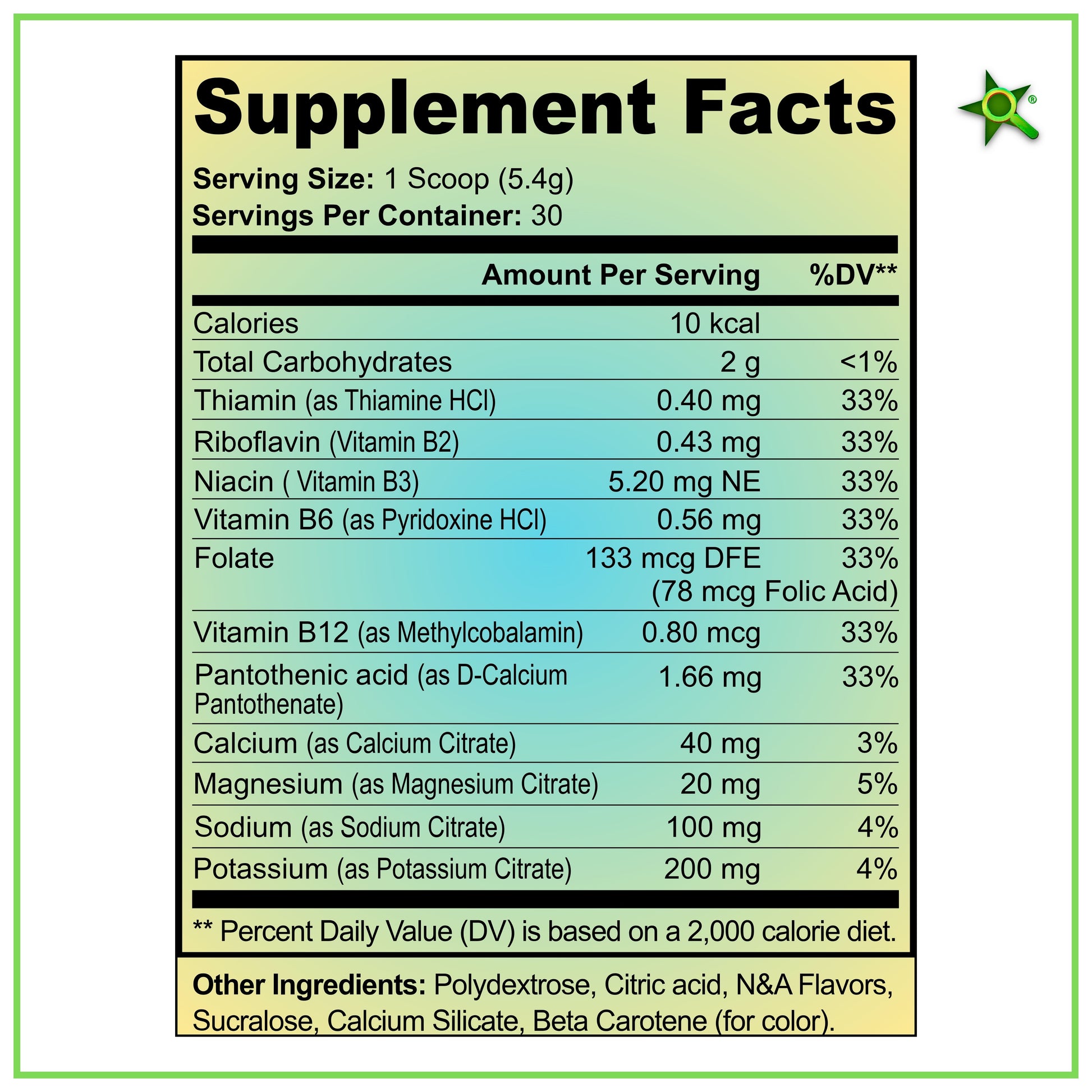 Ingredients: Vitamin B1 (Thiamin), Vitamin B2 (Riboflavin), Vitamin B3 (Niacin), Vitamin B6 (Pyridoxal 5 Phosphate), Vitamin B9 (Folate), Vitamin B12 (Methylcobalamin), Calcium (Calcium Citrate), Magnesium (Magnesium Citrate), Sodium (Sodium Citrate), Potassium (Potassium Citrate), Polydextrose, Citric Acid, Natural & Artificial Flavors, Sucralose, Calcium Silicate, Fruit & Vegetable Blend (for color)