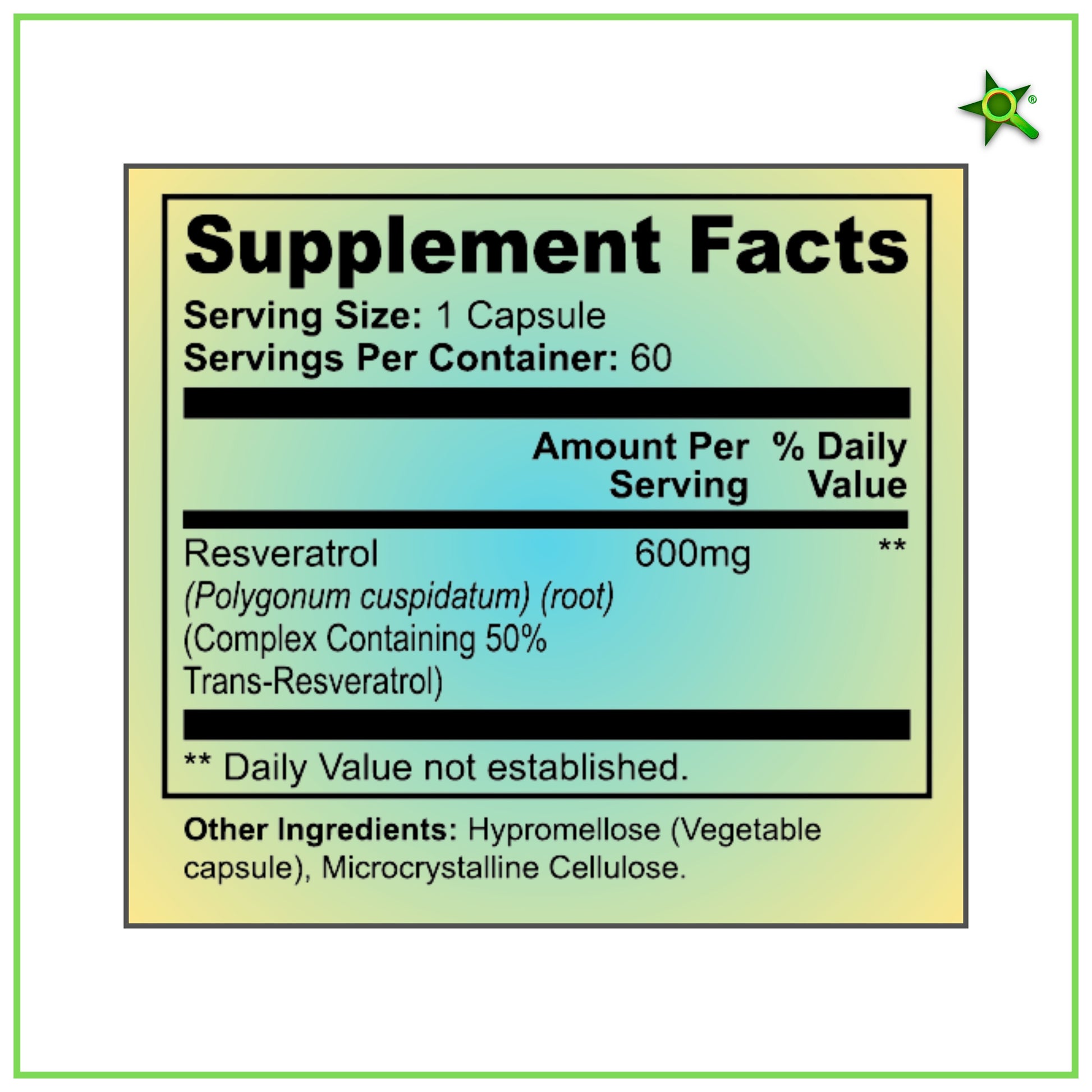 Ingredients: Resveratrol (Polygonum cuspidatum)(root) Complex Containing 50% Trans-Resveratrol, Hypromellose (vegetable capsule), Microcrystalline Cellulose.