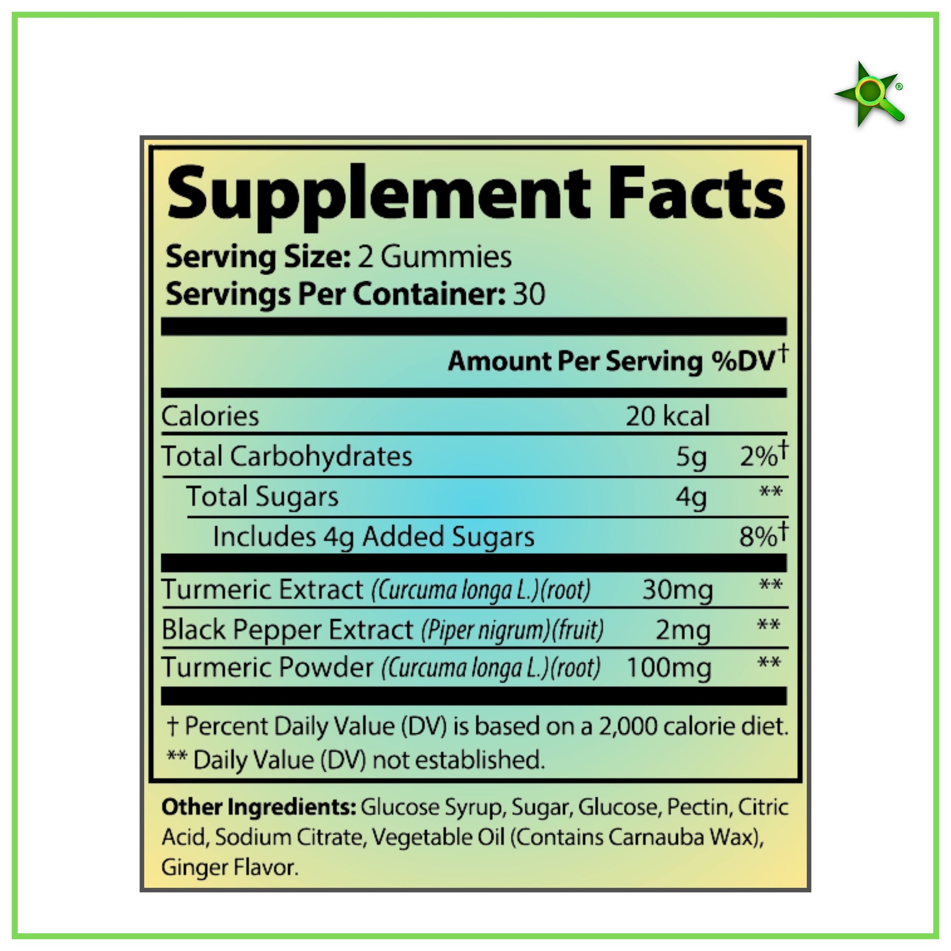 Ingredients: Sodium (as Sodium Citrate), Turmeric Extract (Curcuma longa L.)(root), Black Pepper Extract (Piper nigrum)(fruit), Turmeric Powder (Curcuma longa L.)(root), Glucose Syrup, Sugar, Glucose, Pectin, Citric Acid, Sodium citrate, Vegetable Oil, (contains Carnauba Wax), Ginger Flavor.