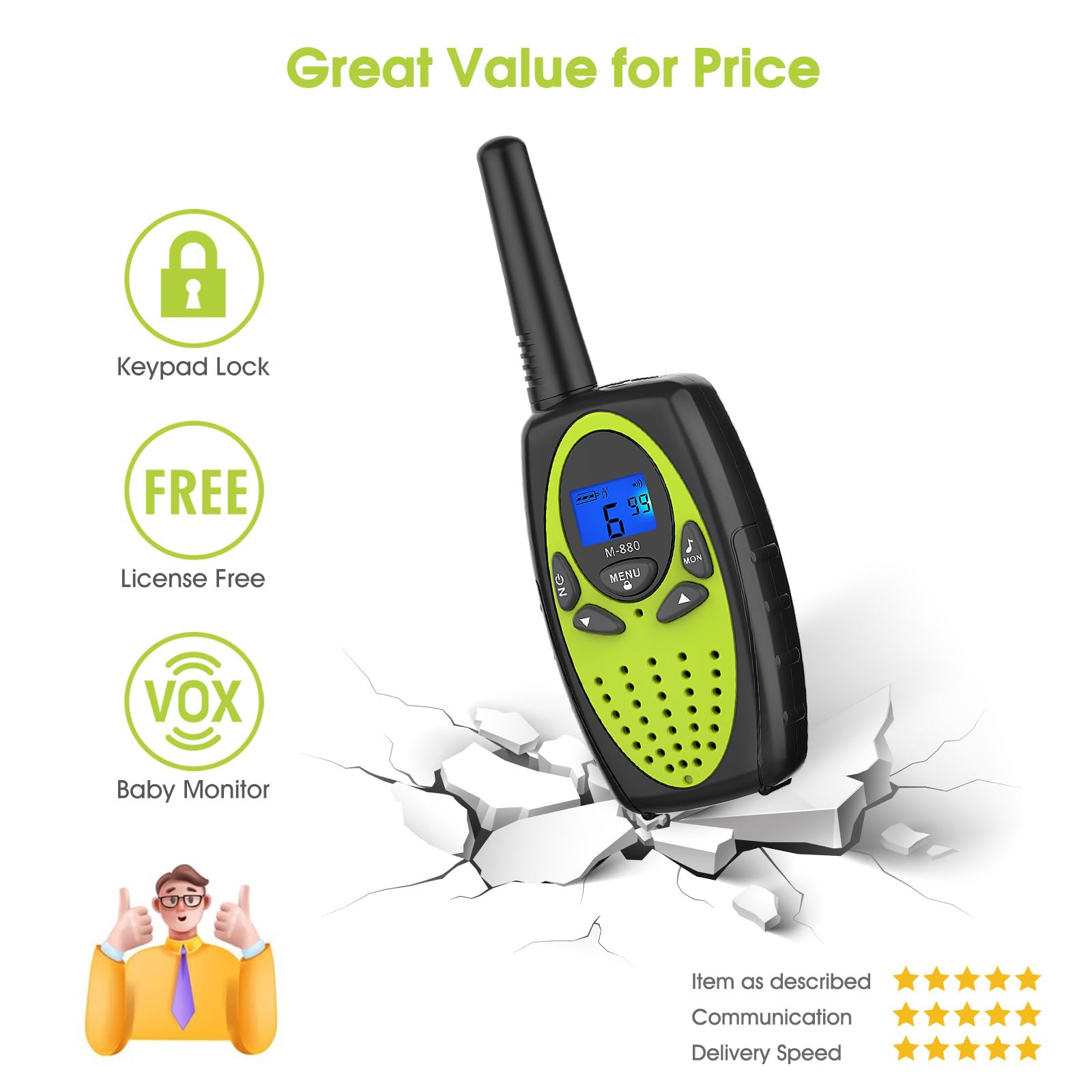 - 【Friendly Design】:Palm size, Lightweight(2.9oz), Hands free function(VOX), Keypad lock(Channel lock), Adjustable power and volume, LCD screen with backlight, Belt clip with lanyard hole, 2.5mm Earpiece jack with dust plug, Durable and environmentally friendly materials(ABS)